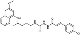 (E)-1-(3-(4-Chlorophenyl)acryloyl)-4-(4-(6-methoxyquinolin-8-ylamino)pentyl)semicarbazide (7g): Compound 7g was synthesized according to the general procedure using chloride 4g (0.201 g, 1 mmol) and compound 6 (0.286 g, 0.9 mmol). After purification by column chromatography (petroleum ether/EtOAc/MeOH = 30:10:5) and trituration with ether, compound 7g was obtained (0.256 g, 59%, m.p. = 185–187.5 °C). IR (KBr) (cm−1): 3337, 3230, 3037, 2966, 2937, 2362, 2343, 1697, 1661, 1625, 1592, 1521, 1490, 1458, 1425, 1408, 1391, 1354, 1290, 1266, 1239, 1221, 1199, 1161, 1090, 1052, 1010, 982, 945, 899, 866, 819, 790, 726, 676, 628, 495. 1H-NMR (δ/ppm): 9.79 (s, 1H), 8.53–8.52 (dd, 1H, J = 1.06, 4.11), 8.08–8.05 (dd, 1H, J = 1.30, 8.25), 7.88 (s, 1H), 7.61–7.59 (d, 2H, J = 8.47), 7.50–7.45 (m, 3H), 7.43–7.40 (m, 1H), 6.64–6.60 (d, 1H, J = 15.89), 6.51–6.48 (t, 1H, J = 5.44), 6.46 (s, 1H), 6.25 (s, 1H), 6.11–6.09 (d, 1H, J = 8.71), 3.81 (s, 3H), 3.62 (m, 1H), 3.04 (m, 2H), 1.61–1.51 (m, 4H), 1.20–1.19 (d, 3H, J = 6.25). 13C-NMR (δ/ppm): 164.63, 159.05, 158.03, 144.68, 144.33, 138.28, 134.89, 134.56, 134.18, 133.68, 129.64, 129.35, 129.09, 122.19, 120.75, 96.17, 91.66, 55.06, 47.08, 39.02, 33.47, 26.77, 20.28. MS (ESI): m/z = 482.2 [M + H]+. Anal. Calcd. For C25H28ClN5O3: C, 62.30; H, 5.86; N, 14.53. Found: C, 62.69; H, 6.01; N, 14.30.