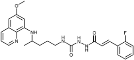 (E)-4-(4-(6-Methoxyquinolin-8-ylamino)pentyl)-1-(3-(4-(trifluoromethyl)phenyl)acryloyl)semicarbazide (7j): Compound 7j was synthesized according to the general procedure using chloride 4j (0.235 g, 1 mmol) and compound 6 (0.286 g, 0.9 mmol). After purification by column chromatography (CH2Cl2/MeOH = 95:5) and crystallization from ether/petroleum ether, pure compound 7j was obtained (m.p. = 123 °C, decomp.). A portion of product 7j crystallized from the reaction mixture. It was filtered off and washed with water. Overall yield: 0.311 g, 67%. IR (KBr) (cm−1): 3266, 1695, 1664, 1612, 1525, 1469, 1425, 1390, 1327, 1235, 1169, 1118, 1067, 834, 789, 728, 631, 592. 1H-NMR (δ/ ppm): 9.85 (s, 1H), 8.54–8.53 (d, 1H, J = 3.71), 8.08–8.06 (d, 1H, J = 8.07), 7.90 (s, 1H), 7.78 (s, 4H), 7.59–7.56 (d, 1H, J = 15.92), 7.43–7.41 (m, 1H), 6.77–6.74 (d, 1H, J = 15.90), 6.47 (s, 2H), 6.28 (s, 1H), 6.12–6.11 (d, 1H, J = 8.58), 3.83 (s, 3H), 3.64 (m, 1H), 3.07–3.05 (m, 2H), 1.65–1.47 (m, 4H), 1.22–1.21 (d, 3H, J = 6.06). 13C-NMR (δ/ ppm): 164.10, 158.98, 157.80, 144.61, 144.19, 138.73, 137.75, 134.73, 134.49, 129.64–129.01 (q, J = 31.19), 129.53, 128.13, 126.81–121.32 (q, J = 271.67), 125.76, 122.77, 122.02, 96.07, 91.63, 54.93, 47.01, 39.02, 33.42, 26.63, 20.17. MS (ESI): m/z = 516.2 [M + H]+. Anal. Calcd. For C26H28F3N5O3: C, 60.57; H, 5.47; N, 13.58. Found: C, 60.22; H, 5.24; N, 13.33.