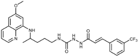 (E)-4-(4-(6-Methoxyquinolin-8-ylamino)pentyl)-1-(3-(3-(trifluoromethyl)phenyl)acryloyl)semicarbazide (7i): Compound 7i was synthesized according to the general procedure using chloride 4i (0.235 g, 1 mmol) and compound 6 (0.286 g, 0.9 mmol). After purification by column chromatography (CH2Cl2/MeOH = 95:5) and crystallization from dichloromethane, pure compound 7i was obtained (0.343 g, 74%, m.p. = 86–88 °C, decomp. IR (KBr) (cm−1): 3254, 2964, 1659, 1618, 1577, 1521, 1456, 1424, 1388, 1334, 1222, 1199, 1166, 1126, 1075, 976, 900, 822, 792, 694, 660, 625, 561, 514. 1H-NMR (δ/ppm): 9.77 (s, 1H), 8.54 (d, 1H, J = 2.58), 8.08–8.06 (d, 1H, J = 7.91), 7.92–7.88 (m, 3H), 7.75–7.73 (d, 1H, J = 7.53), 7.68–7.65 (t, 1H, J = 7.55), 7.61–7.59 (d, 1H, J = 15.88), 7.43–7.41 (m, 1H), 6.78–6.76 (d, 1H, J = 15.89), 6.47 (s, 2H), 6.28 (s, 1H), 6.12–6.11 (d, 1H, J = 8.50), 3.83 (s, 3H), 3.64 (m, 1H), 3.07–3.06 (m, 2H), 1.65–1.49 (m, 4H), 1.22–1.21 (d, 3H, J = 6.00). 13C-NMR (δ/ppm): 164.18, 158.99, 157.81, 144.62, 144.20, 137.75, 135.90, 134.74, 134.50, 132.14–127.87 (q, J = 214.50), 131.15, 130.07–129.41 (q, J = 30.02), 130.06, 129.53, 125.84, 123.98, 122.11, 122.03, 96.08, 91.64, 54.94, 47.03, 39.02, 33.43, 26.64, 20.18. MS (ESI): m/z = 516.1 [M + H]+. Anal. Calcd. For C26H28F3N5O3: C, 60.57; H, 5.47; N, 13.58. Found: C, 60.60; H, 5.81; N, 13.77.
