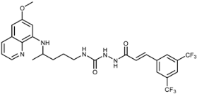 (E)-1-(3-(3,5-Bis(trifluoromethyl)phenyl)acryloyl)-4-(4-(6-methoxyquinolin-8-ylamino)pentyl)semicarbazide (7k): Compound 7k was synthesized according to the general procedure using chloride 4k (0.303 g, 1 mmol) and compound 6 (0.286 g, 0.9 mmol). After purification by column chromatography (CH2Cl2/MeOH = 95:5) and crystallization from toluene, pure compound 7k was obtained (0.294 g, 56%, m.p. = 118–119.5 °C, decomp.). IR (KBr) (cm−1): 3393, 3335, 3220, 3020, 2942, 2363, 1647, 1617, 1579, 1521, 1459, 1425, 1384, 1340, 1280, 1224, 1175, 1135, 1053, 971, 942, 898, 847, 823, 792, 730, 683, 629, 599, 561, 519, 466. 1H-NMR (δ/ppm): 9.81 (s, 1H), 8.55–8.53 (dd, 1H, J = 1.62, 4.19), 8.29 (s, 2H), 8.12 (s, 1H), 8.09–8.07 (dd, 1H, J = 1.58, 8.31), 7.99 (s, 1H), 7.72–7.68 (d, 1H, J = 15.92), 7.77–7.41 (m, 1H), 6.94–6.90 (d, 1H, J = 15.97), 6.51–6.47 (m, 2H), 6.28 (s, 1H), 6.14–6.11 (d, 1H, J = 8.74), 3.82 (s, 3H), 3.64 (m, 1H), 3.06 (m, 2H), 1.66–1.48 (m, 4H), 1.22–1.21 (d, 3H, J = 6.28). 13C-NMR (δ/ppm): 163.86, 159.02, 157.78, 144.65, 144.27, 137.67, 136.28, 134.83, 134.53, 131.40–130.40 (q, J = 33.53), 129.60, 128.22, 127.28–119.14 (q, J = 272.61), 125.53, 124.23, 122.13, 96.13, 91.61, 55.01, 47.04, 39.02, 33.45, 26.74, 20.25. MS (ESI): m/z = 584.3 [M + H]+. Anal. Calcd. For C27H27F6N5O3: C, 55.57; H, 4.66; N, 12.00. Found: C, 55.60; H, 4.83; N, 12.29.