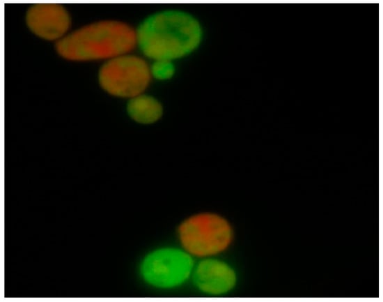 Differentiation between viable and dead cells of C. albicans ATCC 10231 was determined using the fluorescent dye exclusion method [21]. One hundred microliters of inoculum suspension (1.5 McFarland units) were mixed with 900 μL of RPMI 1640 (with 2% of glucose) containing oleuropein in concentrations of 12.5 mg·mL−1, 1.25 mg·mL−1, and 0.195 mg·mL−1. Amphotericin (1 μg·mL−1) served as a positive control. The samples were incubated at 35 °C for 3 h. DNA-binding dyes (ethidium bromide and acridine orange) were added to the samples at a final concentration of 100 μg/mL (1:1; v/v), and samples were analyzed. Three classes of cells were observed: viable, apoptotic, and necrotic cells.