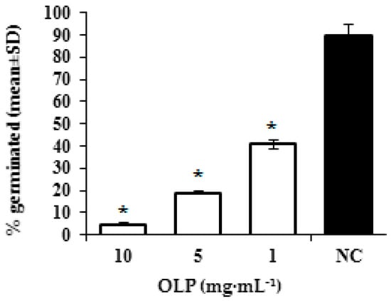 Effect of different concentrations of oleuropein (OLP) on germ-tube formation in C. albicans; NC—intact cells. The data are shown as means ± SD from three independent experiments (* p < 0.05 in comparison to NC).