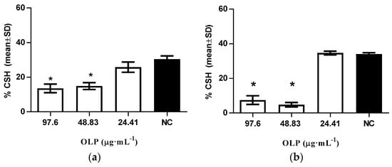Effect of different concentrations of oleuropein (OLP) on modulation of cellular surface hydrophobicity in (a) aerobic conditions; and (b) anaerobic conditions; NC-intact cells. The data are shown as means ± SD from three independent experiments (* p < 0.05 in comparison to NC).