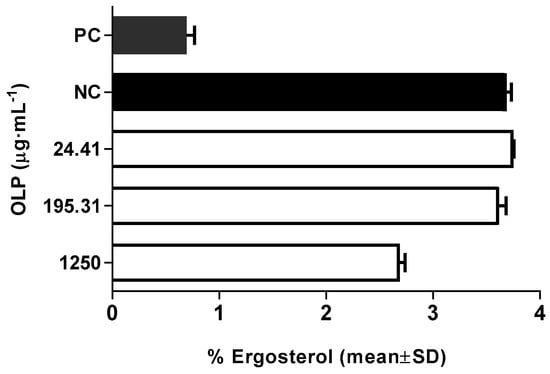 Modulation of ergosterol content at different concentration of oleuropein (OLP); PC-amphotericin 1 μg·mL−1; NC-intact cells. Results represent the mean of three experiments ± SD (p < 0.05 in comparison to NC).
