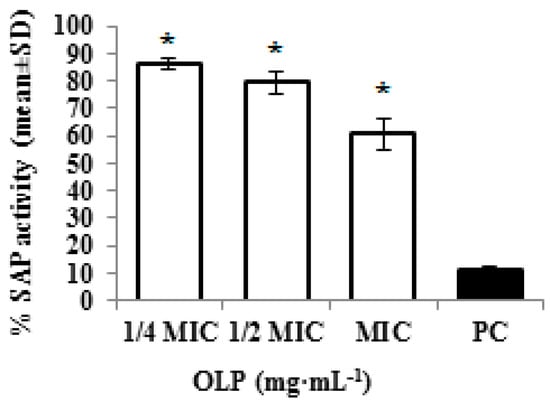 SAP activity of C. albicans treated with different concentrations of oleuropein OLP (1/4 MIC—3.12 mg·mL−1, 1/2 MIC—6.25 mg·mL−1, MIC—12.5 mg·mL−1); PC—pepstatin 0.1·mg·mL−1. Results represent the mean of three experiments ± SD (* p < 0.05 in comparison to PC).