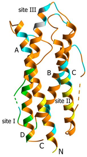 Crystal structure of human IL-11 (PDB entry 4MHL [20]). α-Helices A to D are labelled. Dashed lines mark the non-resolved regions. The residues comprising the proposed sites for IL-11 interaction with IL-11Rα (site I, green) and gp130 (site II, yellow; site III, grey) receptors [20] are indicated. The residues not conserved in either macaque or mouse IL-11 are shown in cyan (see Figure S1).