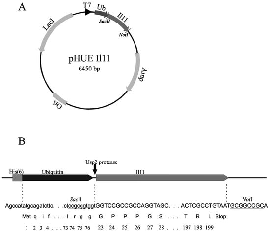 Indeed, Escherichia coli (E. coli) cells are widely used for production of IL-11 as a mature protein lacking a signal peptide (human IL-11 [25,26]) or as a fusion protein (human [27,28,29,30] or murine IL-11 [31]). The predominance of the latter approach seems to be due to higher expression levels provided by the use of fusion constructs [27]. Following this trend, we expressed macaque and murine orthologues of IL-11 as a fusion with ubiquitin (‘Ub’), instead of thioredoxin, tumor necrosis factor-α or glutathione S-transferase, used by others [27,28,29,30,31]. This approach was previously validated for preparation of human IL-11 [32]. We cloned the nucleotide sequence encoding the mature murine or macaque IL-11, which similarly to Oprelvekin lacks Pro1 residue (Table S1), into the pHUE expression vector based on pET15b [33] between the SacII and NotI restriction sites (Figure 2).