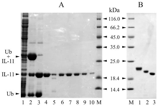 Figure 3 shows progress of the fusion expression, IL-11 cleavage from the fusion protein and subsequent purification stages, controlled by SDS-PAGE. The soluble cellular extract and the affinity-purified chimeric sample reveal spontaneous degradation of the Ub-IL-11 fusion giving rise to the fragments with molecular masses resembling those for Ub and IL-11 (Figure 3A, lanes 1 and 2).