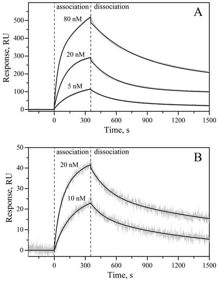 Functional activity of IL-11 includes its ability to recognize the cognate receptors and to induce the intracellular signaling mediated by gp130 receptor. To estimate rIL-11 affinity to interleukin-11 receptor subunit α (‘IL-11Rα’), the interaction between rIL-11 and recombinant extracellular domain of human IL-11Rα with a fused His-tag at the C-terminus (‘sIL-11Rα’) was studied by surface plasmon resonance (SPR) spectroscopy. The SPR sensograms for biotinylated rIL-11 immobilized on the surface of NLC sensor chip exhibit a concentration-dependent association-dissociation pattern in response to 5–80 nM sIL-11Rα (Figure 5). The kinetic SPR data are well approximated by the heterogeneous ligand model (1) with equilibrium dissociation constants, Kd, of 4.2 nM and 8.9 nM for macaque rIL-11 and 2.2 nM and 14.6 nM for murine rIL-11 (Figure 5, Table 1). The 1.6-fold higher affinity of macaque rIL-11 (Kd2) is in line with its 1.6-fold lower kinetic dissociation constant, kd2. These estimates are close to the Kd (7 nM and 21.9 nM) and kd (3.5 × 10−4 s−1 and 3.84 × 10−3 s−1) values previously measured by SPR for interaction of human rIL-11, immobilized on the chip surface by amine coupling, with sIL-11Rα [32].