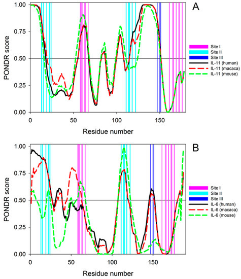 Furthermore, disordered regions are commonly involved in protein-protein interactions [50,52,67,68,69,70,71]. Results of disorder propensity analysis are represented in Figure 6 that clearly shows the presence of noticeable difference in the conservation of disorder profiles of IL-11 and IL-6 proteins. In fact, irrespectively of their origin and in agreement with available structural information both IL-11 and IL-6 are predicted to be mostly ordered proteins that are expected to have IDPRs. Figure 6A illustrates that despite their relatively low sequence identity, IL-11 proteins from three organisms are characterized by very similar disorder profiles, indicating that the peculiarities of disorder distribution within their sequences are evolutionary conserved and, therefore, suggesting that intrinsic disorder-related features might be of functional importance.