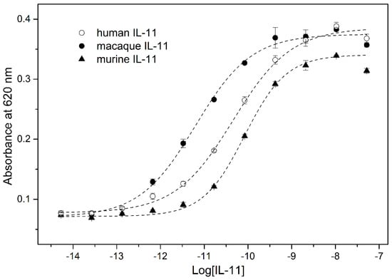 Since the macaque/mouse rIL-11 proteins exhibit the affinities to the extracellular domain of IL-11Rα receptor (Table 1) equivalent to that reported in literature, they are expected to have analogous affinity to full-sized IL-11Rα receptor. If this interaction is accompanied by efficient engagement of gp130 receptor, the rIL-11 samples should initiate intracellular signaling. To verify this suggestion, an ability of the rIL-11 to activate Signal transducer and activator of transcription 3 (STAT3) was studied using modified HEK-Blue™ IL-6 cells line, stably transfected with human IL-11Rα gene as described in ref. [32]. The secreted embryonic alkaline phosphatase (SEAP) is liberated in response to STAT3 activation and detected using QUANTI-Blue™ colorimetric assay. An increase in rIL-11 concentration is accompanied by SEAP secretion, which follows STAT3 activation with EC50 values of 6 pM, 46 pM and 84 pM for macaque, human and murine rIL-11, respectively (Figure 7). The EC50 values for human and murine rIL-11 are in accord with the previous reports on IL-11-dependent proliferation of B9 and 7TD1 cells (EC50 of (20–40) pM [22,37]). The about an order of magnitude higher activity of macaque rIL-11 relative to human and murine rIL-11 could be both due to its higher affinity to gp130 receptor (see Table 1 for affinity to sIL-11Rα) and more efficient activation of IL-11 receptor(s). The proximity of EC50 value for macaque rIL-11 to plasma IL-11 level ((1.3–2.3) pM [38]) makes it a potent STAT3 activator. Since macaque rIL-11 has high sequence identity (93.8%) to its human counterpart (Oprelvekin) that was used in clinical practice for prevention of chemotherapy-induced thrombocytopenia, it represents a potentially more effective substitution for Oprelvekin.
