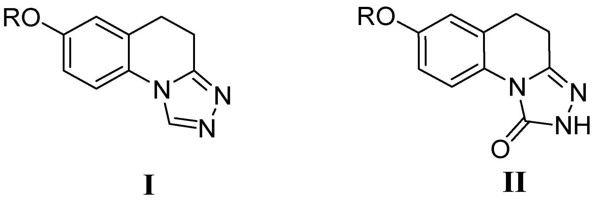 In our previous work, we reported that [1,2,4]triazolo[4,3-a]quinoline derivatives (I) and [1,2,4]triazolo[4,3-a]quinoline-1(2H)-ones (II) exhibited potential anticonvulsant activity [7,8]. Therefore, in this study, we evaluated the anticonvulsant activity of 9-alkoxy-5,6-dihydro-[1,2,4]triazolo[3,4-a]isoquinoline and 9-alkoxy-5,6-dihydro-[1,2,4] triazolo[3,4-a]isoquinolin-3(2H)-one, respectively.