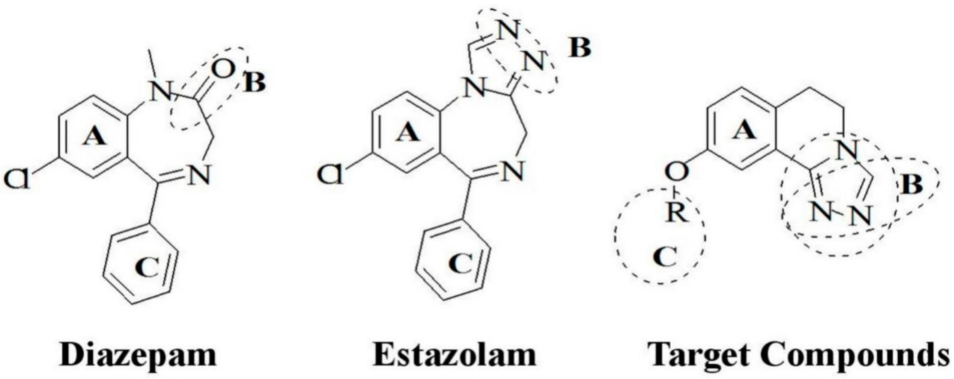 The structures of diazepam, estazolam, and the target compounds. (The dotted line was used to mark the special group).