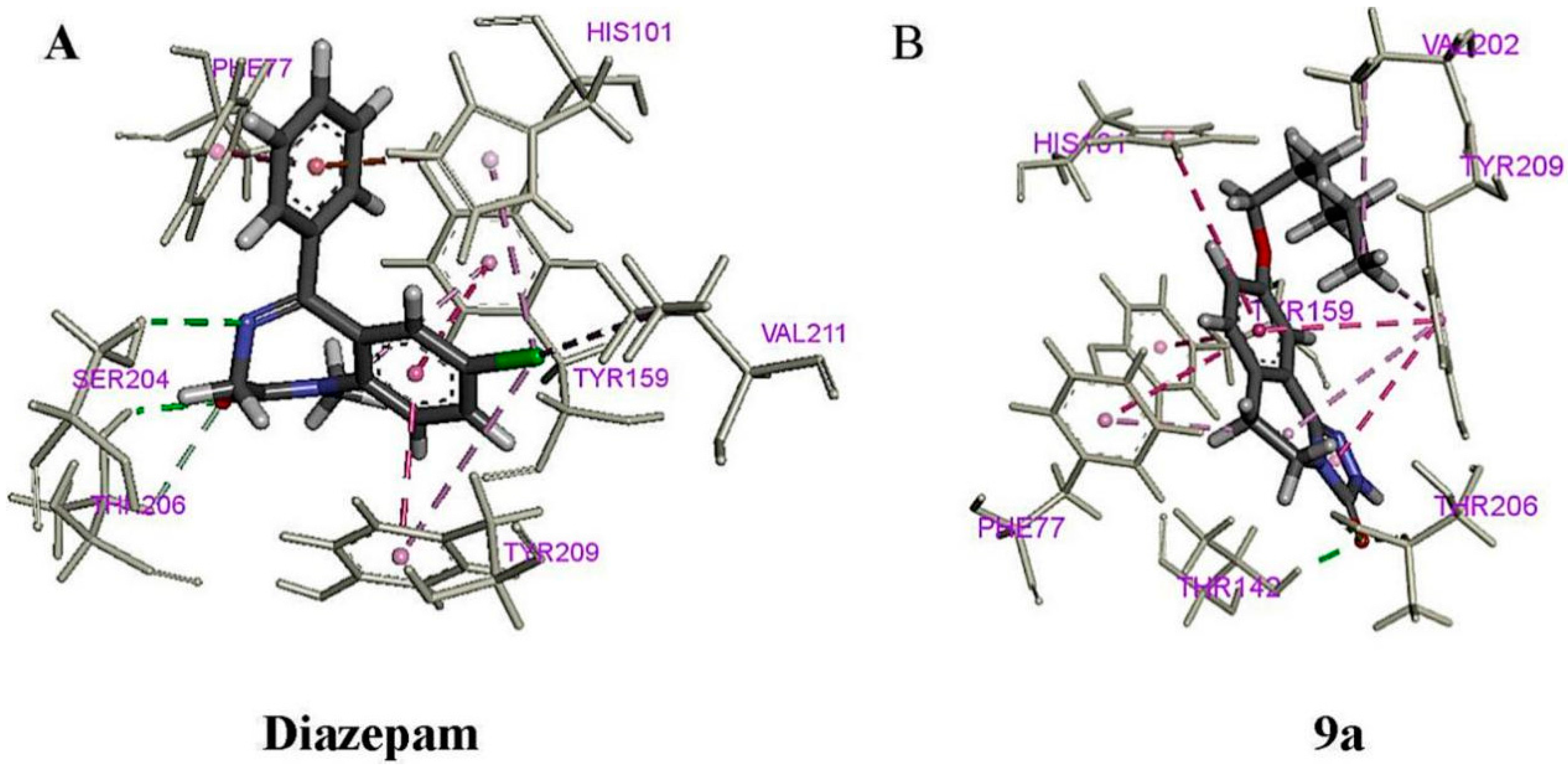 To confirm whether the anticonvulsant activity of compound 9a is mediated through BZD receptors, a docking study was performed using Discovery Studio™ Server—Client (2017). As shown in Figure 3A, α1 Thr206, α1 Tyr 209, α1 His101, α1 Tyr159, and γ2 Phe77 are the most important residues in the binding mode of diazepam [23]. As shown in Figure 3B, the oxygen atom was responsible for conventional hydrogen bond (green dotted lines) interaction with α1 Thr206 and γ2 Thr142, and the length of bond was 2.95 and 1.88 Å. The benzene ring of compound 9a was responsible for π-π (pink lines) interaction with α1 Tyr159, α1 Tyr 209, α1 His101 and γ2 Phe77, respectively. Besides, the oxygen atom in the alkoxy chain was interacted by carbon-hydrogen bond (laurel-green line) interaction with α1 Tyr159. Therefore, the results showed that the binding mode of compound 9a was similar to that of diazepam in the BZD-binding pocket of the GABAA receptor.