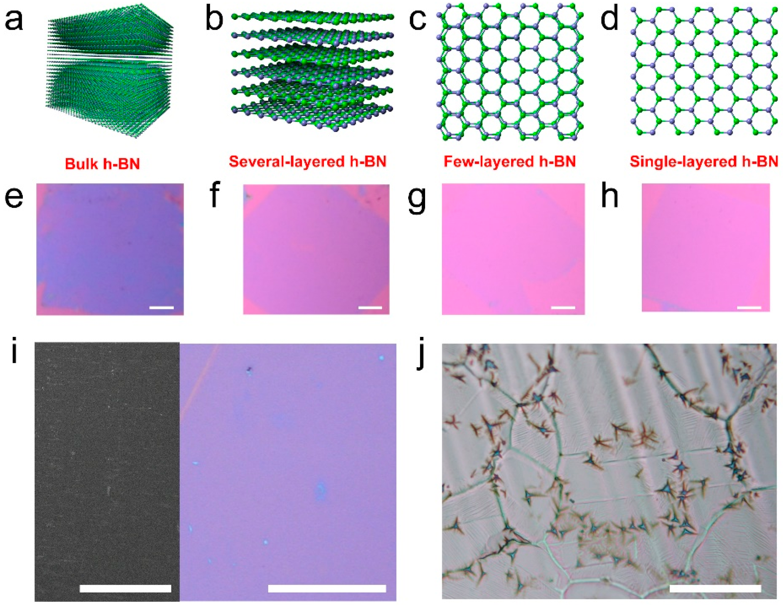 Figure 1 shows optical images and illustrations of as-transferred h-BN films. Figure 1a–d are illustrations of bulk, six-layer, double-layer and single-layer h-BN, respectively. Figure 1e–h are corresponding optical images of as-transferred h-BN films on SiO2 substrates (thickness: 285 nm). Their layer numbers from left to right are >10, five to six, two to three, and one to two layers, respectively. The thick h-BN on SiO2 is green while thinner h-BN turns to light purple. We noticed that, for several-layer h-BN (>3 nm), the thickness uniformity and coverage is not as good as for few-layered h-BN on Ni (Supplementary Materials Figure S1). As it can be seen in Figure 1e, there are tiny holes in the film. The h-BN films in Figure 1e–h were prepared at a growing temperature of 1000 °C (Figure 1i). If the growing temperature is high (>1100 °C) and the duration is long (>1 h), high crystalline h-BN stars can be found (Figure 1j).