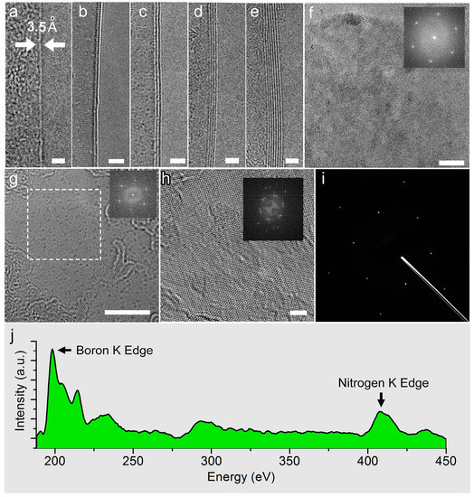 - Lee, K.H.; Shin, H.-J.; Lee, J.; Lee, I.-Y.; Kim, G.-H.; Choi, J.-Y.; Kim, S.-W. Large-Scale Synthesis of High-Quality Hexagonal Boron Nitride Nanosheets for Large-Area Graphene Electronics. Nano Lett. 2012, 12, 714–718. [Google Scholar] [CrossRef] [PubMed]