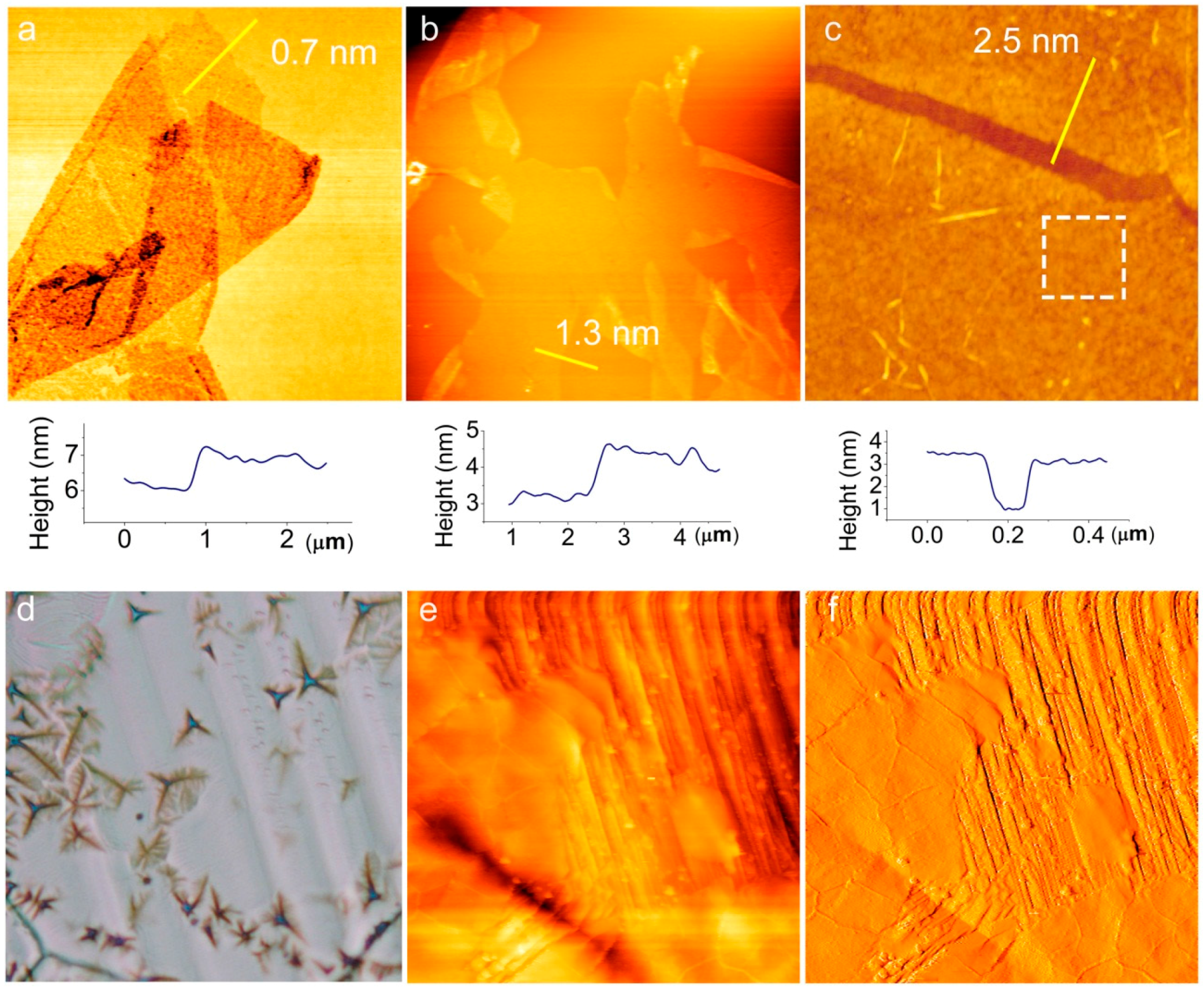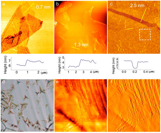 AFM morphologies of as-transferred h-BN on SiO2 with thicknesses of 0.78 nm (a); 1.3 nm (b) and 2.5 nm (c), respectively, corresponding to one- to two-layered, three- to four-layered and six- to seven-layered h-BN. Inset of each image shows the height profile of the cross-sections. The sizes of Figure (a–c) are 10 µm × 10 µm, 30 µm × 30 µm= and 1.5 µm × 1.5 µm; (d) Optical image of h-BN bulk; (e,f) Topography and corresponding current sensing AFM image of h-BN on Ni foil. Size: 20 µm × 20 µm. Thickness: ~20 nm.