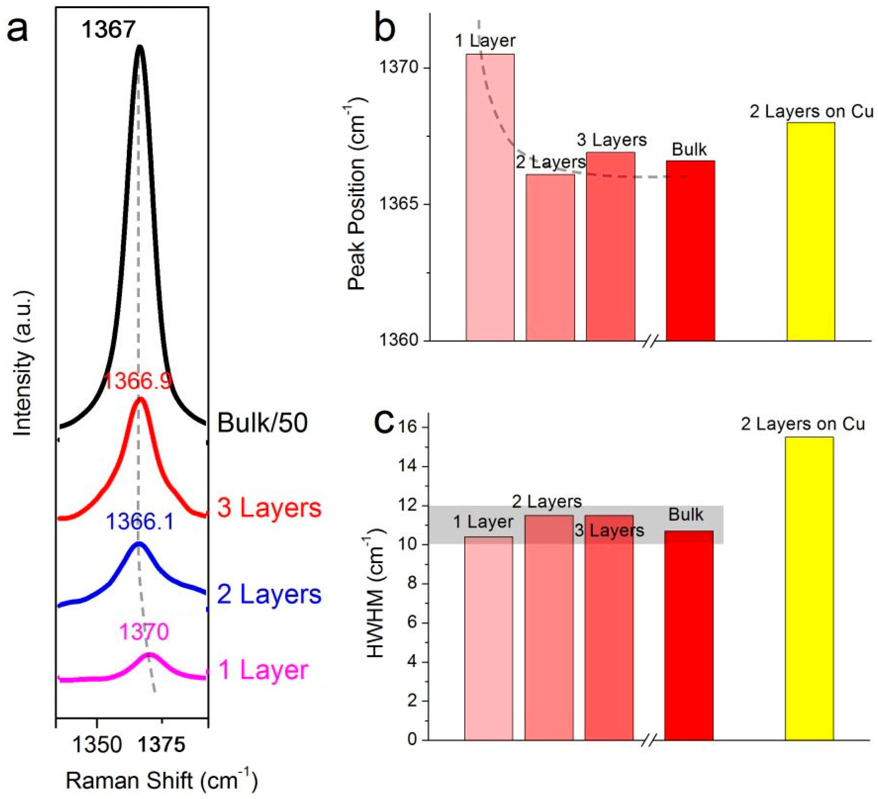 Raman signature of h-BN films. (a) Raman spectra of one-layer, two-layer and three-layer h-BN films and bulk h-BN; (b) Peak position (E2g) of h-BN film versus thickness; (c) HWHM of E2g peak versus thickness.
