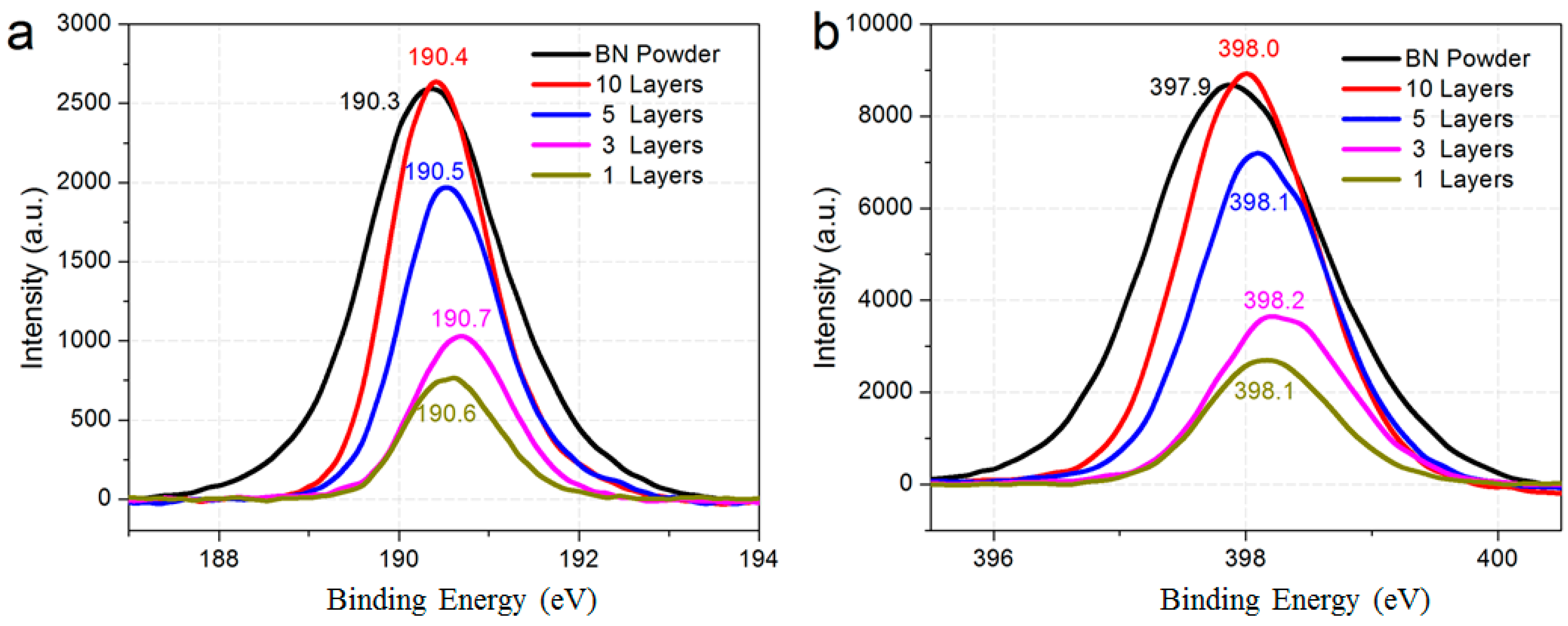 The XPS spectra of h-BN films with various thicknesses are represented in Figure 5a,b. It was previously reported that the B 1s core level of hexagonal boron nitride locates at ~190 eV and the N 1s core level locates at 398 eV. For the single-layered and few-layered h-BN film that was grown, the peak from B located from 190.3 to 190.7 eV, and the peak from N locate from 379.9 to 398.2 eV, consistent with the reported values. Furthermore, h-BN powder is used for comparison. The B and N peak positions are ~190.3 and 397.9 eV, close to the value from CVD growth. The atomic concentration of the h-BN that was grown is 50% ± 4%, showing an excellent stoichiometry ratio of B and N. The slight redundancy may come from the nitric residual during transfer. Also, under the same conditions, the intensity of h-BN becomes weak while the h-BN film is less than five layers.