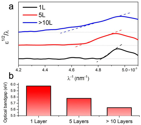 Ultraviolet-visible adsorption spectra of h-BN films of various thicknesses taken at room temperature. (a) UV adsorption spectra of 1 L, 5 L and thick (>10 L) h-BN films (ε1/2/λ versus 1/λ); (b) Calculated optical bandgap for each h-BN film.
