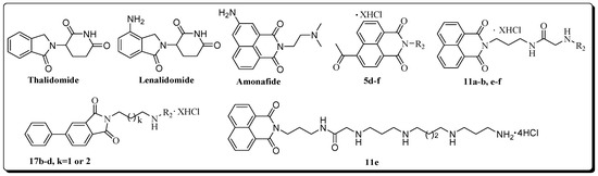 The structures of 5d–f, 11a–b, e–f, 17b–d, thalidomide, lenalidomide and amonafide (X = 2, 3, 4; R2 = deprotected polyamine chain).