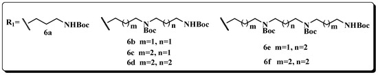The acetyl-substituted naphthalimide-polyamine compounds 5d–f were synthesized according to Scheme 1. Intermediates 2 and 3 were prepared by a modified previously reported procedure [23,24]. The respective N-Boc protected intermediates 4d–f were obtained by the condensation of R1NH2 (6, the Boc protected polyamines were prepared by a modified previously reported procedure) [25] (as shown in Figure 2) with 4-acetyl-1,8-naphthalic anhydride (3). After purification by flash column chromatography, these intermediates were mixed with 4 M HCl in EtOH at room temperature to obtain the target compounds 5d–f as their hydrochloride salts with a yield between 70% and 80% [22].