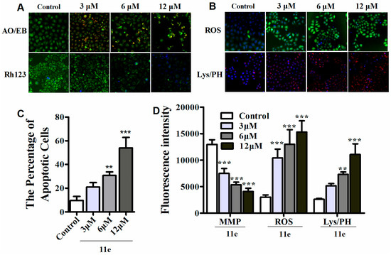 The apoptosis and MMP (mitochondrial membrane potential), ROS (reactive oxygen species) and lysosomal mass/pH (Lys/PH) were investigated in HepG2 cells in vitro. (A) The cellular morphous, MMP were detected with AO/EB, Rh123/Hoechst33342 staining using HCS in HepG2 cells; (B) ROS, lysosomal mass/pH were detected by HCS using DCFH-DA and Lyso-Tracker Red staining respectively; (C) 11e induced apoptotic cells at different concentrations (3, 6, 12 μM) assessed by HCS using AO/EB staining after 48 h treatment in HepG2 cells (n = 3, x ± SD, ** p < 0.01, *** p < 0.001); (D) Impacts of 11e at different concentrations (3, 6, 12 μM) on MMP, ROS, lysosomal mass/pH, detected by HCS using Rh123, DCFH-DA, and Lyso-Tracker Red staining respectively after 48 h treatment in HepG2 cells. Each sample is the mean of three independent experiments. (n = 3, x ± SD, ** p < 0.01, *** p < 0.001).