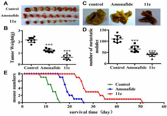Antitumor activity of 11e was evaluated in vivo. (A) Photographs of tumor obtained from each treatment group excised on day 10; (B) Tumor weight in subcutaneous model, compared with control: (*** p < 0.001, x ± SD), n = 9; (C) Lung metastasis photograph; (D) Lung metastasis nodus numbers for pulmonary metastasis in mice treatment with 11e, amonafide, and normal saline. (*** p < 0.001, x ± SD), n = 8; (E) The changes of body weight of mice treated with 11e, amonafide, and normal saline; (E) Kaplan-Meier curves showing survival of mice treated with 11e, amonafide, and normal saline.