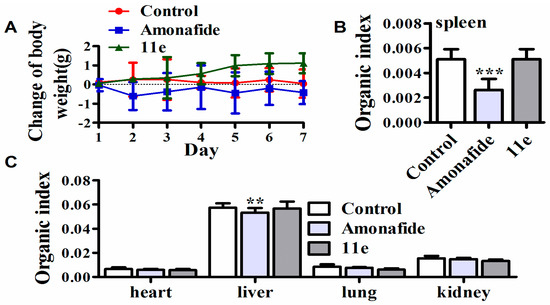 Systemic toxicity of 11e. (A) The changes of body weight of mice treated with 11e, amonafide, and normal saline; (B) The organ indexes of immune organ (spleen) were evaluated after treatment with 11e, amonafide, and normal saline (n = 3, x ± SD *** p < 0.001); (C) The organ indexes (heart, liver, kidney and lung) were evaluated after treatment with 11e, amonafide, and normal saline (n = 3, x ± s ** p < 0.01).