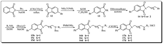 Intermediates 12, 13 were prepared by a modified previously reported procedure [26,27]. Compound 13 (1.13 g, 5 mmol) added portion wise to 1,3-dibromopropane or 1,4-dibromobutane (10 mmol) in acetone (30 mL). The solution was refluxed for 12 h; after cooling and filtration, the solvent was removed under vacuo to give a solid. The latter was recrystallized from ethanol to afford compound 14a–b.
