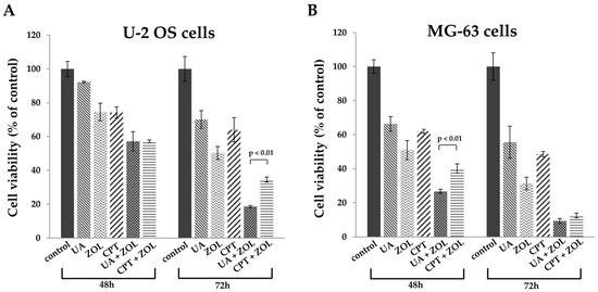 Zoledronic acid enhances ursolic acid-mediated inhibition of cell viability. MTT assays were performed with U-2 OS cells (A) or MG-63 cells; (B) treated with either ZOL (10 μM), UA (20 μM), CPT (5 μM) or a combination of ZOL/UA, or ZOL/CPT at different time points. Three independent experiments were conducted.
