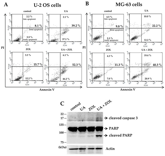 To determine whether programmed cell death is involved in the combined anti-proliferative effect of UA/ZOL, we analyzed cells for apoptotic subpopulations. In both lines of U-2 OS and MG-63 cells, a 48-h exposure of either single compound or in combination all induced a significant increase in apoptosis (Figure 4A,B). More importantly, cells exposed to combinational treatment exhibited enhanced apoptosis compared with those of single compound treatment, supported by the enhanced activated caspase-directed poly(ADP-ribose) polymerase (PARP) cleavage (Figure 4C).
