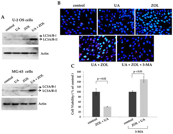 We also investigated the probability that these compounds induce autophagy-related mechanism, a type II programmed cell death, in these cells. Autophagy is a self-digestion and bulk-degradation mechanism that protects cells in response to stresses; on the other hand, it may be cytotoxic depending on cell type and their context. Protein analysis has revealed that the ZOL exposure increased the formation of LC3A/B-II, an indication for autophagy induction, compared to that of control or UA exposure (Figure 5A). Interestingly, the expression of LC3A/B-II in cells exposed to UA/ZOL combination was markedly enhanced, suggesting an additive effect between UA and ZOL in both lines of osteosarcoma cells (Figure 5A). We also confirmed an enhanced formation of autophagic vacuoles as appeared as red fluorescent in cells exposed to both UA and ZOL, compared to those treated with a single compound (Figure 5B). Given that autophagy can either enhance cell survival or be cytotoxic, cell viability was determined using MTT assays to evaluate the role of UA/ZOL-induced autophagy in osteosarcoma cells. We showed that UA/ZOL combination has greatly reduced cell viability compared to control group (Figure 5C). Interestingly, in the presence of autophagy antagonist 3-methyladenine (3-MA), the UA/ZOL combination failed to suppress cell viability, indicating that the combined anti-proliferative effect was rescued by the autophagy inhibitor (Figure 5C). These various lines of evidence all support that autophagy contributes to the combined anti-growth effect of ZOL and UA in osteosarcoma cells.