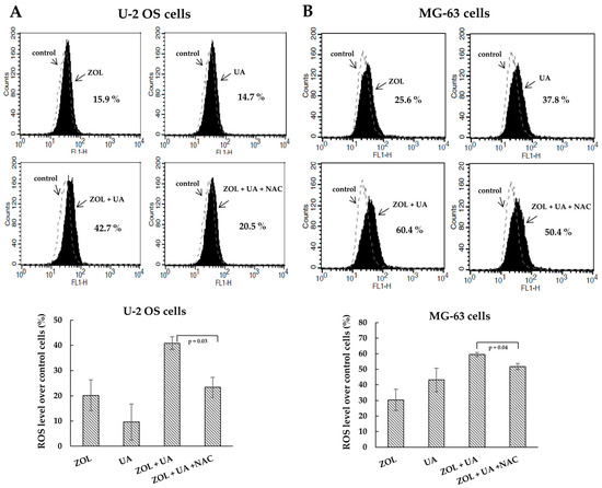 Zoledronic acid combines with ursolic acid to enhance reactive oxygen species (ROS) generation. U-2 OS cells (A) or MG-63 cells; (B) were treated with either ZOL (10 μM), UA (20 μM) or a combination of ZOL/UA in the absence or presence of N-acetyl-l-cysteine (NAC) (2 μM) for 16 h. The cells were stained with hydroethidine (10 μM) and ROS levels were analyzed by flow cytometry. Numbers indicated the induced levels of ROS in drug-treated cells compared to control cells. The results were calculated by a median of fluorescence intensity in each group.