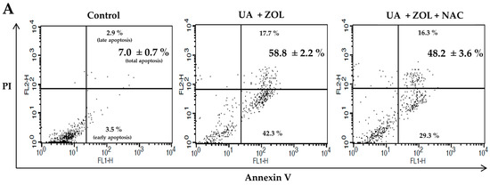 2.2. ROS Was Associated with Apoptosis Induced by Combination of Zoledronic Acid and Ursolic Acid