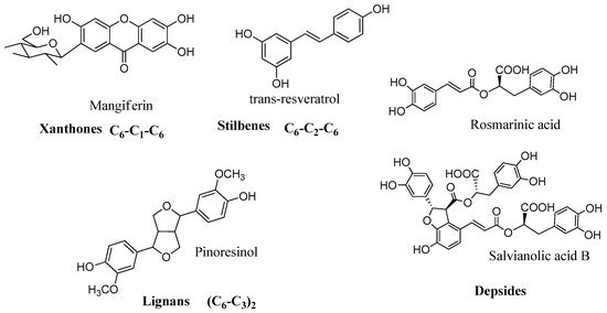 With the advent of chromatographic techniques and the development of phytochemistry, the term polyphenol was expanded to include a wider range of molecules with at least two phenolic rings in their skeleton: xanthones, stilbenes and stilbenoids, depsides, phenylpropanoid derivatives, lignans and lignin (Figure 3) and, most importantly, flavonoids (Figure 4), which are by far the biggest group [32] of polyphenolic compounds.