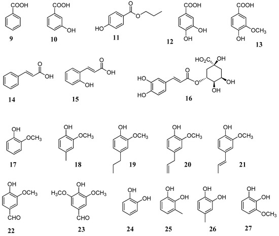Structures of tested phenols: benzoic acid (9), m-benzoic acid (10), propylparaben (11), protocatechuic acid (12), vanillic acid (13), cinnamic acid (14), o-coumaric acid (15), chlorogenic acid (16), guaiacol (17), 4-methylguaiacol (18), 4-propylguaiacol (19), eugenol (20), isoeugenol (21), vanillin (22), syringaldehyde (23), catechol (24), 3-methylcatechol (25), 4-methylcatechol (26), 3-methoxycatechol (27) [45].