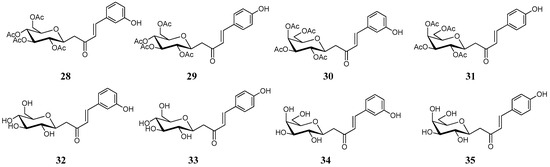 In this concept, a series of synthetic C-cinnamoyl glycosides were synthetized and considered for the inhibition on twelve mammalian isoforms of carbonic anhydrase (Figure 8) [52]. These compounds combined two functional groups with known activity against the hCAs: the cinnamoyl and the glucose group. In order to avoid undesirable degradation, the O-glycosidic bond was replaced by the more stable C-glycosidic one. The C-cinnamoyl glycosides (28–35) were generally effective CAs, with inhibition constants in the low micromolar range against CA I, II, IV, VA, VB, VI, VII, IX, XII, XIII, XIV and ineffective inhibitors of CA III (Table 3).
