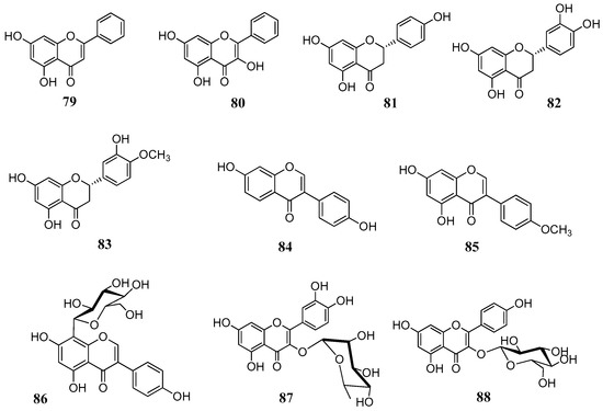 Structures of flavone 79, flavonol 80, flavanones 81–83, isoflavones 84, 85, isoflavone glucoside 86 and flavonol glycosides 87–88.
