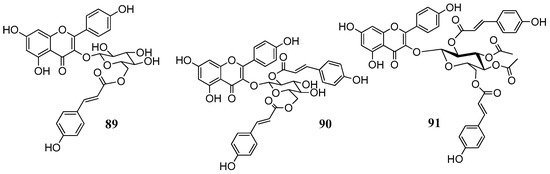Structures of tested acylated flavonol glycosides 89–91 (isolated from Quercus ilex) [71].
