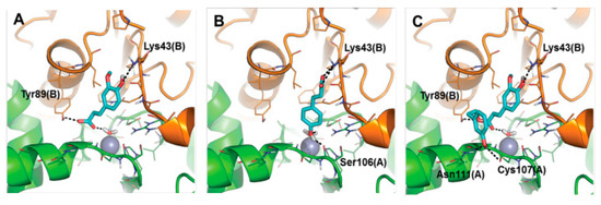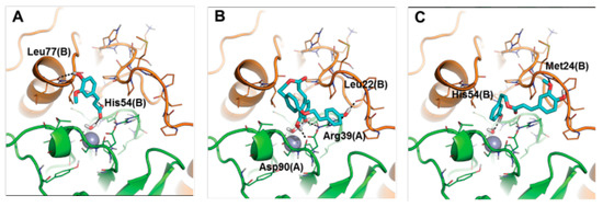 Predicted binding mode of 2 (panel A), 4 (panel B) and 8 (panel C) towards the active site of Rv1248 β-CA from Mtb. Monomer A is colored green, monomer B is colored orange. Small molecules are shown as cyan sticks. Residues within 5 Å from the Zn(II) ion and those in contact with the inhibitors are shown as lines. H-bond interactions are highlighted by black dashed lines. Residues involved in H-bonds are labeled. The catalytic Zn(II) ion is shown as a grey sphere [85].