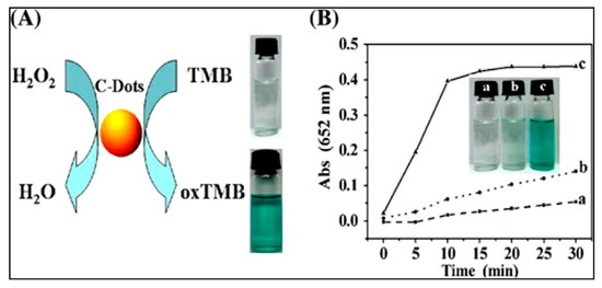 (A) Schematic illustration of oxidation color reaction of TMB by H2O2 catalyzed by C-dots; (B) Time-dependent absorbance changes at 652 nm of TMB in different reaction systems: (a) C-dots + TMB, (b) TMB + H2O2 and (c) TMB + C-dots + H2O2 in sodium acetate buffer (0.2 M) at pH 3.5 and a temperature of 35 °C. Reproduced with permission from [36]. Copyright (2011) Royal Society of Chemistry.