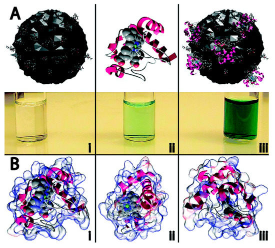 (A) Neat carbon nanodots (C-dots) did not display any catalytic activity, as evidenced by the lack of green color in (Ai); while native cytochrome c (cyt c) was found to exhibit weak peroxidase activity (Aii); When C-dots were combined with cyt c, the peroxidase activity was dramatically enhanced, indicated by the rapid formation of the oxidized form of ABTS (i.e., appearance of intense green color), as shown in (Aiii); (B) Different orientations of the electrostatic calculations performed on cyt c show that a majority of the protein surface is positively charged (blue areas), with the bulk of the positive charge residing in the vicinity of the heme group. Reproduced from [54].