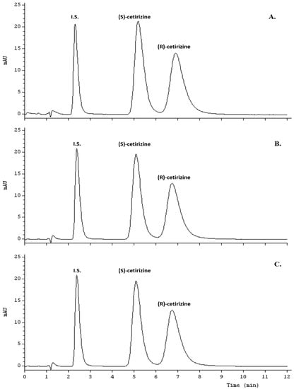 Recoveries were calculated as the percentage of each analyte response (peak areas) after the sample preparation procedure mentioned above and compared to that of non-extracted samples containing the analyte at a corresponding concentration of six independently made replications at three concentration levels, i.e., 2.5, 10.0 and 20.0 µg·mL−1 for (S)-cetirizine and (R)-cetirizine and at 2.7, 27.0 and 45.0 µg·mL−1 for paraben M and 0.3, 3.0 and 5.0 µg·mL−1 for paraben P. The results obtained in the accuracy study are presented in Table 3.