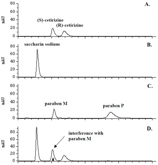 Typical chromatograms showing separation of: (A) standard solutions of racemic cetirizine (20 µg·mL−1); (B) standard solution of saccharium sodium (20 µg·mL−1); (C) mixture of standard solution of paraben M (10 μg·mL−1) and paraben P (20 μg·mL−1); (D) Zyrtec® 10 mg·mL−1 oral drops after direct dilution; (E) Zyrtec® 1 mg·mL−1 oral solution after direct dilution.