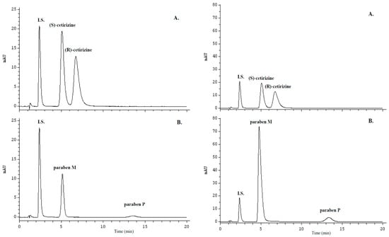 Representative chromatograms for ZYRTEC® 10 mg·mL−1 oral drops (on the left) and for ZYRTEC® 1 mg·mL−1 oral solution (on the right); (A) cetirizine enantiomers and moclobemide as an internal standard (Step II of the two-step liquid-liquid extraction procedure); (B) M and P parabens with moclobemide as an internal standard (Step I of the two-step liquid-liquid extraction procedure).