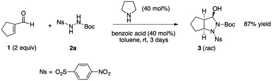 We began our research by examining the pyrrolidine-catalyzed addition/cyclization of cyclopentene-1-carboxaldehyde (1) with 1-Boc-2-(4-nitrobenzenesulfonyl)hydrazine (2a) [20] using benzoic acid as a co-catalyst. After some experiments, we found that by using 40 mol % of both pyrrolidine and benzoic acid the expected bicyclic pyrazolidin-3-ol 3 was obtained in excellent yield (87% isolated yield after chromatographic purification) and as a single isomer (dr > 30:1), after three days in toluene at room temperature (r.t.) (Scheme 2).