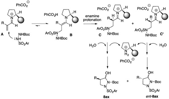 3.2.2. Asymmetric Synthesis of Pyrazolidinols from Enals and Hydrazines