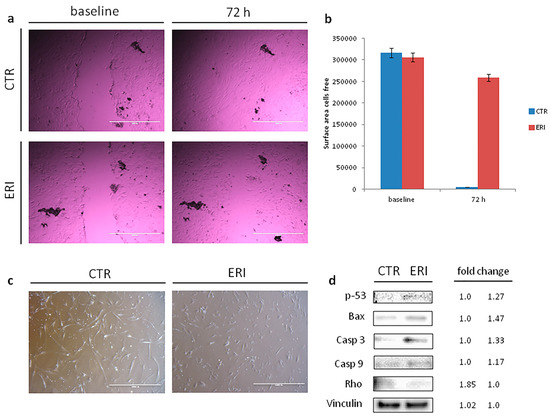 (a) Scratch wound assay. Wounds were generated after cell confluence. Cell migration and wound closure were assessed after 72 h, 4× images of primary culture (control sample and treated sample) at baseline and after 72 h, scale bar 1000 µm; (b) Areas of migration measured in the control sample and treated sample on days 0 and 3; (c) Morphological changes in the primary culture after eribulin treatment, 4× images, scale bar 1000 µm. After 72 h of treatment, eribulin induced a decrease in cell size, the cells lost some of the cytoplasmic architecture features, rounded up and were reduced in number; (d) Western blot analysis of apoptosis (p-53, Bax, Casp3 and Casp9) and migration-related proteins (Rho) and fold change in protein expression.
