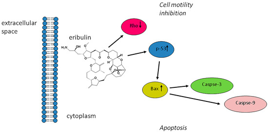 We also observed that eribulin can significantly inhibit cell motility and induce apoptosis. These two non-exclusive molecular mechanisms were shown as the triggers of cell growth and proliferation inhibition. Cell migration inhibition mediated by eribulin was demonstrated by the wound scratch assay (Figure 3a). The reduced expression of migration-related protein Rho suggested the exertion of the eribulin antiproliferative effect through a mechanism entailing cell motility inhibition. To the best of our knowledge, the role of eribulin as a suppressor of Rho expression has not yet been documented in LPS, representing one of the new possible mechanisms of action mediated by eribulin.